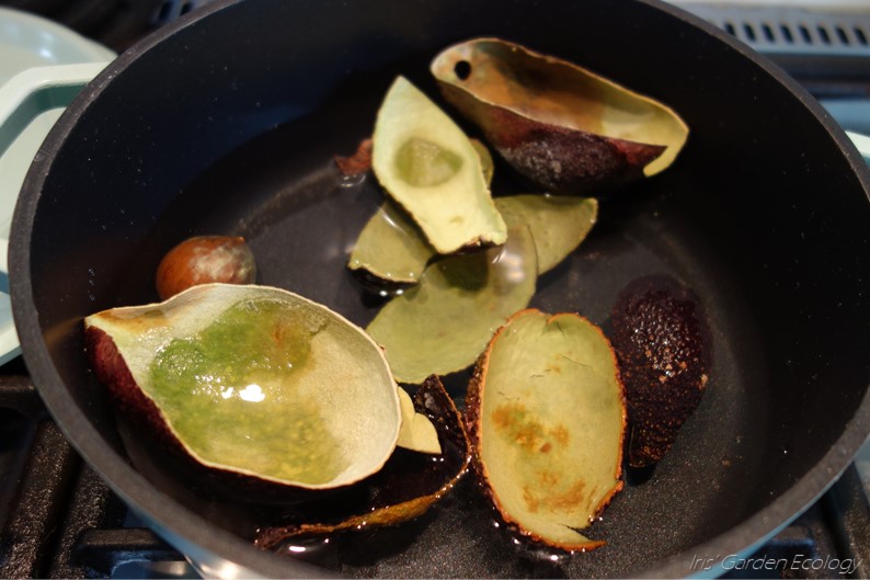 Ik heb over enkele weken avocadoschillen en pitten opgespaard. Ik koos die met zwarte schil, want hoe zwarter, hoe duidelijker roze de kleurstof die eraf komt. Groen en stukjes groen vlees die achterblijven maken de kleur bruiner. Steeds schrobde ik ze gelijk schoon en deed ze in de vriezer. Zo kon ik wachten tot ik tijd had voor dit experiment. De rozige kleur in de schillen en pitten komt dankzij het vriezen ook al wat naar buiten.