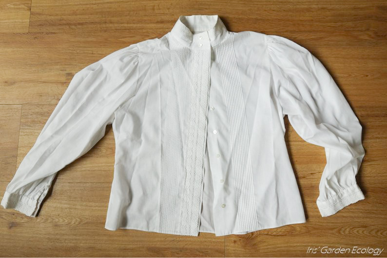 Wat je kiest hangt nogal af van je plant- en textielkeuze. Ik had een (dacht ik, maar daar kom ik later op terug!) katoenen blouse van de tweedehands waarop ik dit wilde uitproberen. Plantenverf hecht vooral (alleen?) aan natuurlijke stoffen zoals katoen, linnen en wol. Voor wol heb je allerlei fixeerstoffen (normaalgesproken op aluminiumbasis) nodig waarvan ik vind dat die het nut om met ‘afval’ te kleuren wel erg teniet doen. Als je dit soort (niet-eetbare) stoffen inzet kun je daarna je pannen en lepels niet meer voor voedsel gebruiken. Voor katoen (en linnen) heb je genoeg aan een kleurstof met tannines (ook een fixeerstof) zoals die in avocadoschillen, uienschillen en walnoten (en eikels!) voorkomt. Ik wilde geen gerommel met speciale chemicaliën (of speciale pannen of rubber handschoenen). Ik koos dus bewust voor katoen en niet wol om dit uit te proberen.