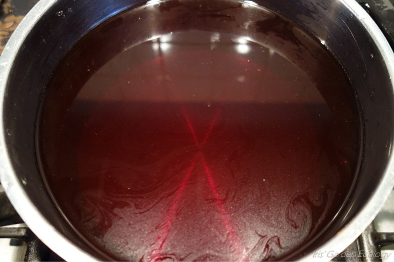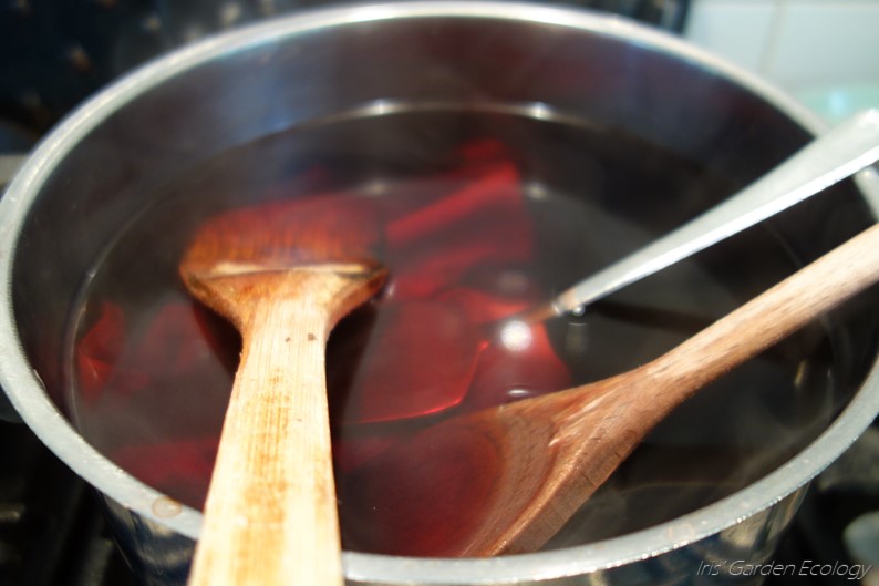 De kleur die je uit je plantenresten krijgt is afhankelijk van hoe veel kleurstof erin zit én de hardheid van het water. Avocado wordt bijvoorbeeld meer oranje in zuurder water en meer roze in basisch (kalkrijk, hoge pH) water. Dit kun je beïnvloeden met de keuze voor leidingwater (meestal kalkrijk) of regenwater. Als je de zuurgraad verder wil verhogen (dus met avocado meer roze wilt maken) dan voeg je bijvoorbeeld bakpoeder of sojamelk toe. Wil je het water zuurder maken, dan werken citroensap of azijn. Ik heb leidingwater gebruikt en dit aangevuld met ongeveer een eetlepel bakpoeder. Dit hoeft niet exact, je voegt meer toe naarmate je niet tevreden bent met de kleur. Omdat alles (technisch gezien) eetbaar was kon ik pannen gebruiken die ik normaal ook voor eten pak.