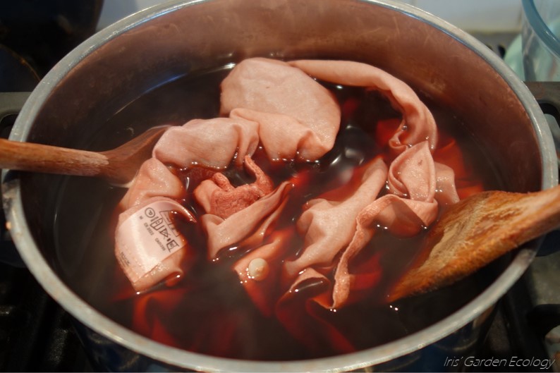 Je kunt zelfs waarde uit je afval halen nog vóór je het in de compost/Bokashi/wormenbak gooit. Met creativiteit is veel mogelijk 😉 Zo kwam ik op het onttrekken van kleurstof uit planten (en in het bijzonder: schillen). Wat zoeken op afbeeldingen van met een bepaalde plant gekleurde textiel en je krijgt een idee wat er mogelijk is. Zo maken uienschillen oranjebruin, walnootschalen bruin, rode kool lichtblauw (met bakpoeder of sojamelk) of mauve (met azijn of citroensap) en brandnetels een bijzondere groengrijs. Zelf viel ik voor de rozige tint van avocado – roze, ja! Ik ben gek op guacamole, dus dat gaf me meteen een excuus om wat schillen en pitten bij elkaar te sparen!