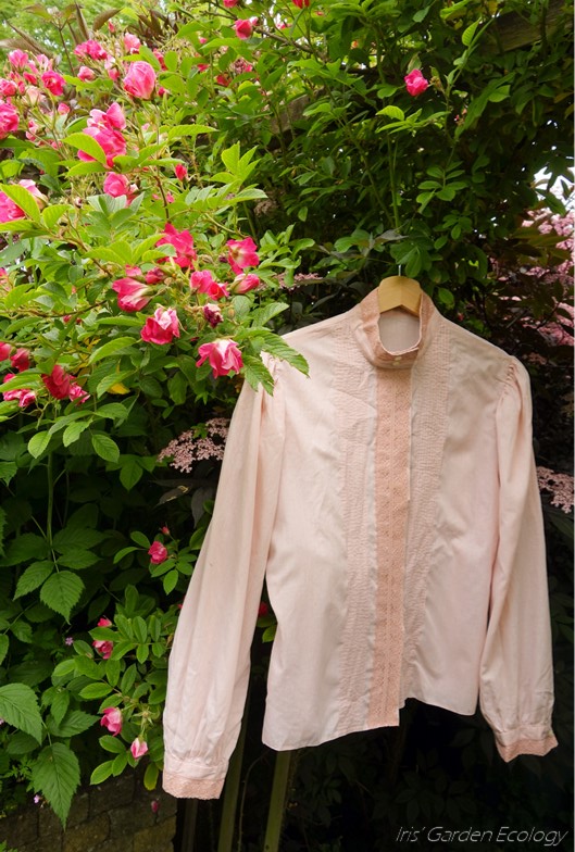 Zelf vind ik de kleur van de blouse mooi, hoewel ik meestal van wat donkerder kleuren hou. Vooral de tint roze is prachtig en het verschil tussen de blouse zelf en het (wel volledig katoenen) kant waardeer ik ook. Dankzij de ontdekking dat het een katoenmix was durfde ik bij het strijken niet veel warmte meer te gebruiken, dus helemaal kreukvrij is het niet 😉