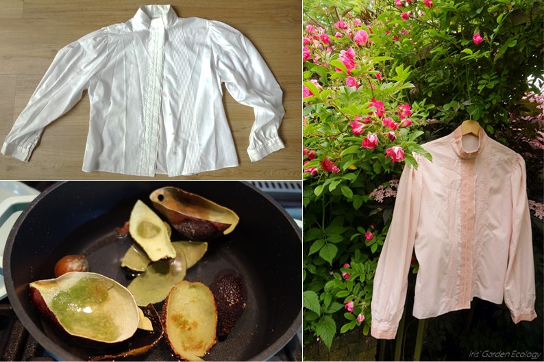 Om mijn arsenaal aan hergebruik-ideeën uit te breiden deed ik een verfexperiment met een tweedehands blouse en avocadoschillen en -pitten. Over het resultaat ben ik niet ontevreden 🙂