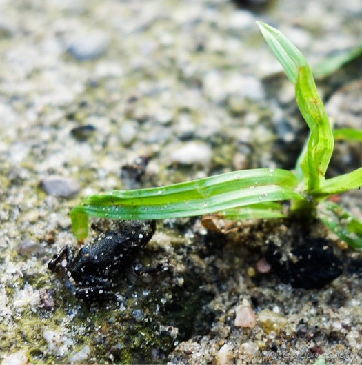 Héérlijk, die kleintjes. Zelfs van binnen zie ik ze massaal over de patio springen/lopen. Het maakt me ook een beetje bezorgd. Het liefst zou ik ze allemaal in een terrarium stoppen tot ze grote, sterke Kikkers geworden zijn en ze dan pas vrijlaten zodat ze minder kwetsbaar zijn. Helaas, dat is natuurlijk geen optie. De al aanwezige kikkers en padden (ook hordes!), insecten, bosmuizen en die malle egel die op de één of andere manier toch ieder jaar in onze volledig ommuurde tuin weet te infiltreren lusten ze wel.