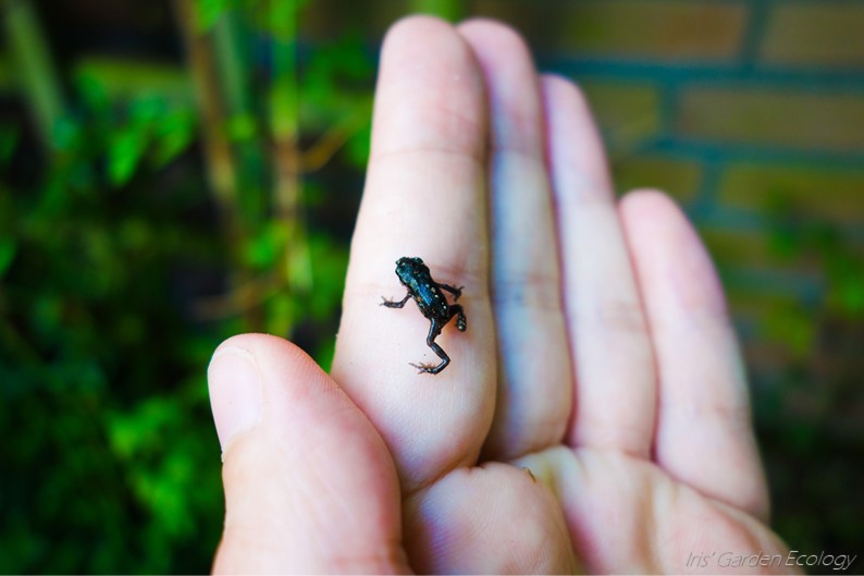 Soms laat ik mini-kikkers in de zitkuil op mijn hand springen en zet ze in de takkenrillen, in het groen of bij een hoopje stenen uit. Of zitten daar meer roofdieren? Dan twijfel ik weer of dat verstandig was. Een deel laat ik dus sowieso in de zitkuil. Verspreiding is hoe soorten in de natuur overleven, dus hun beste kans is alle hoekjes te verkennen. Hoe dan ook zitten ze al door de hele tuin – en ook in de hele tuin zitten dieren die ze eten. Dat weet ik, want het hele voorjaar werden we al van alle kanten door kikkers en padden besprongen, zo vaak dat het niet eens meer bijzonder was (nou ja, altijd wel een beetje). Ik heb gelezen dat ze vaak na 2-3 jaar terugkeren, vaak naar waar ze geboren werden, om zich voort te planten. Dat lijkt met mijn amfibieënvrienden ook zo te zijn, want nog nooit was de tuin zo druk. Dat waren de kleintjes waar we jaren geleden van genoten. Ik ben benieuwd hoe groot mijn plaagbestrijdingsleger over nog eens 2-3 jaar is.