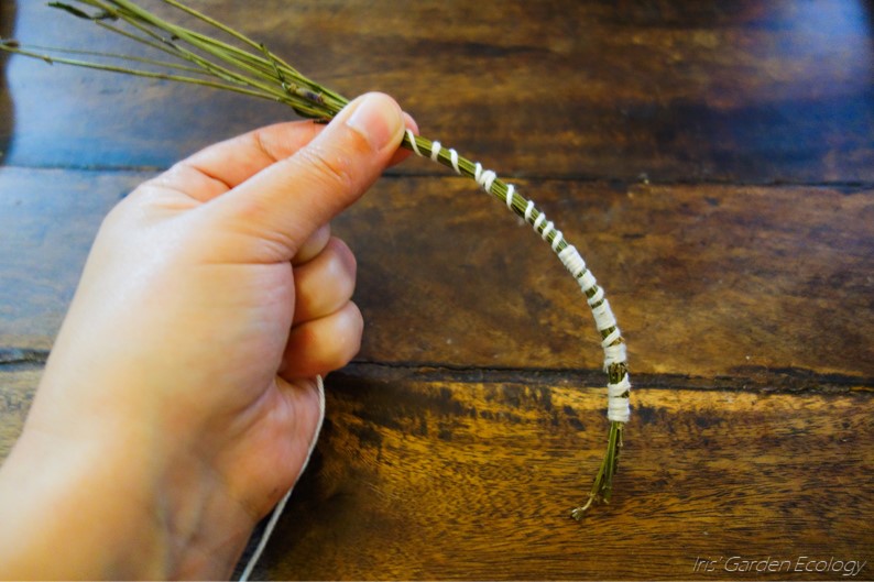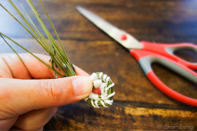 Het begin was makkelijk. Je neemt een smalle bundel stengels, legt de draad erlangs en draait die vervolgens – héél strak – rond de bundel én het uiteinde van de draad om die vast te maken. Ik kreeg wel snel stijve vingers van die druk volhouden, trouwens.