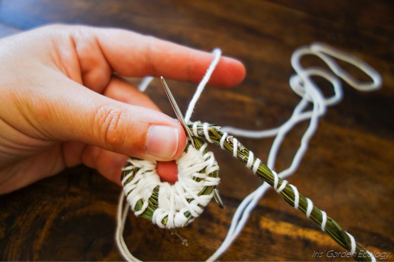 De draad reeg ik aan een naald en prikte deze door het midden, dan sloeg ik deze een of twee keer rond de stengels (de buitenste, waarmee ik bezig was), trok strak en prikte de naald weer door het midden tot ik tenminste drie banen had. Daarna haalde ik de naald steeds langs de buitenste en de eerstvolgende (op één na buitenste) rij.