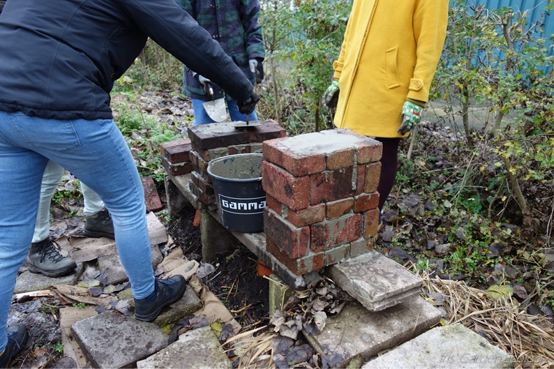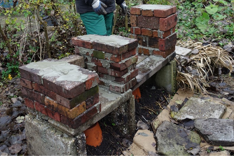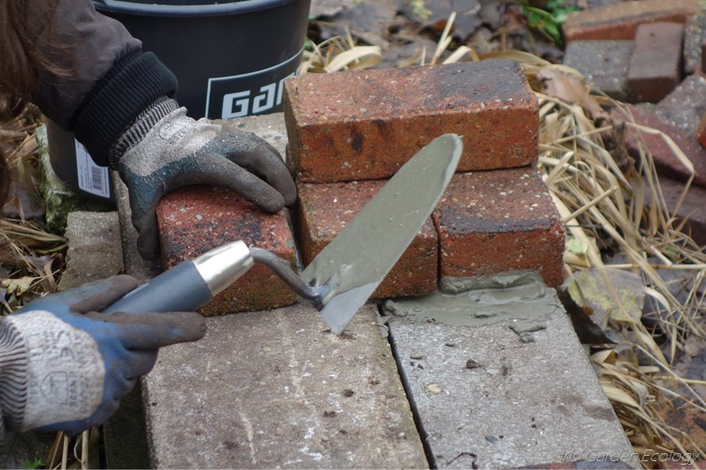 Op de fundering metselden we muurtjes van rondslingerende bakstenen. Dat deden we in halfsteensverband, waarbij de stenen verspringen. We gebruikten cement, omdat het hotel niet omgeduwd moet kunnen worden door de kinderen die soms op de tuin spelen, en omdat vochtige muurtjes makkelijker voor dieren en planten te bevolken zijn. De muurtjes zijn niet allemaal dezelfde hoogte, zodat het dak richting het noordwesten (de windhoek) helt en afwatert.