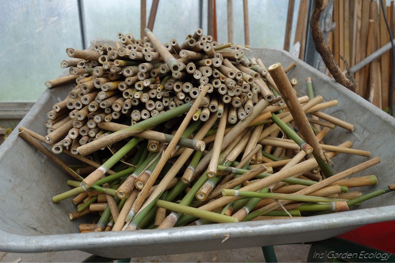 Op de tuin staat een grote kluit bamboe, een overblijfsel van de vorige gebruikers. Het PermacultuurCentrum gebruikt het vooral voor de productie van eigen aanbindstokken en als speelplek voor kinderen. Bamboe is hol vanbinnen, dus ook een perfecte grondstof voor een insectenhotel. Maar: de achterkant van een tunnel moet dicht zijn. Dit zie ik vaak fout gaan bij de bamboestengels in commercieel aangeboden insectenhotels. Terwijl er een simpele truc is. Bamboestengels hebben knopen, onderbrekingen in de stengels waar bladeren uit komen. Hier is de stengel van binnen dicht. Dus als je stukken van een nieuw stengel steeds achter een knoop afknipt, dan krijg je bamboestengels die aan één kant open en aan één kant dicht zijn.