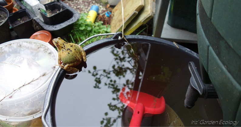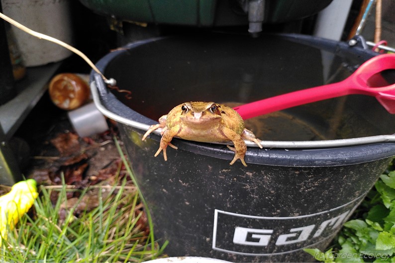 Tijdens het ontbijt zag ik iets vreemds. Twee oogjes staarden me aan vanaf de rand van een emmer. Die staat onder de tap van de regenton en is gevuld met regenwater, omdat de regenton lek is. Er zit een rode tiewrap aan het hengsel, zodat ik weet welke van mij is als ik de emmer eens meeneem op m’n werk. Bovenop die tiewrap zat het dier dat me aanstaarde. Een grote, bruine kikker. Ik denk dat het een zij is, dat zijn die groterds meestal.