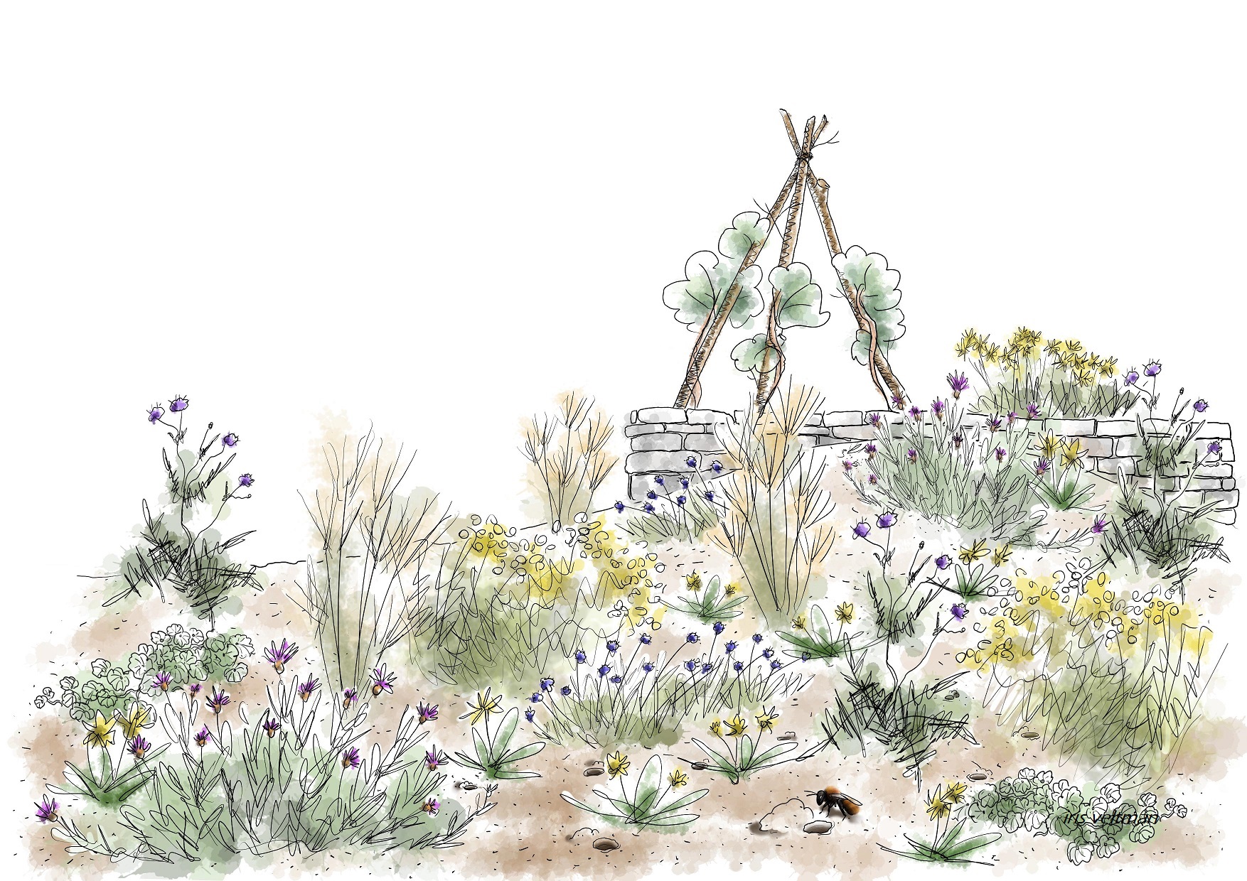 Een stukje kale of niet te sterk doorwortelde grond is dus niet per se slecht! Zoals het zand tussen je tegels of de vochtige kale wand van een oever. Het vosje op de tekening bijvoorbeeld maakt haar nest het liefst in spaarzaam begroeide, zanderige grond. Soms zelfs in het gazon!