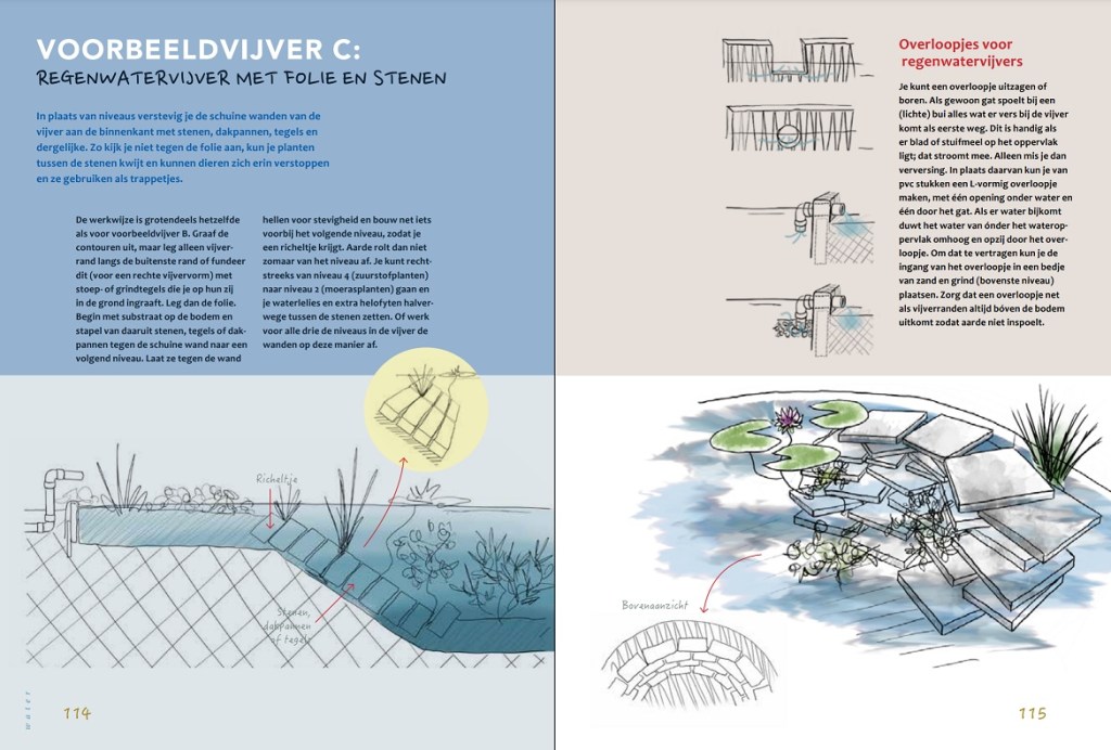 In ‘Water‘ leer je hoe je zelf vijvers aanlegt die niet alleen mooi zijn maar ook allerlei dieren trekken, regen bufferen of overtollig water opvangen. Lees wanneer & waarom je een plantenfilter aanlegt en ontdek ook meteen hóe. Voorkom dat je planten en je bodemleven verpieteren tijdens droogte met al de handige, goedkope en makkelijk zelf te maken oplossingen voor waterbuffering en -infiltratie uit Tuinlogica. Leer afkoppelen én wat je moet doen om waterschade te voorkomen.