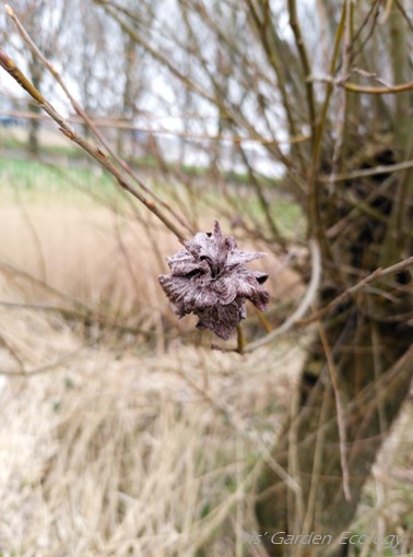 Door de wilgen de kans te geven te bloeien, trekken ze niet alleen bestuivers zoals vlinders en bijen aan, maar krijgt deze wesp of mug blijkbaar ook de kans haar eitjes af te zetten. En zo’n galwesp of -mug is weer voedsel voor andere soorten, van insecten tot spinnen tot vogels. Het galhuisje kan bovendien ook weer allerlei andere diertjes huisvesten! Ik verheug me er nu al op hoe de knotwilgenlaan langs het pad bij Spaarndam over een maand ofzo tot leven zal komen, en plan voor dan alvast weer een rondje met mijn moeder.