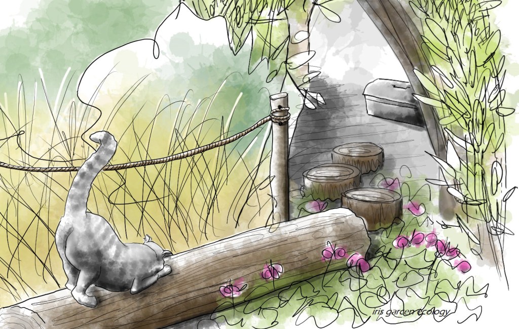 Een groene tuin doet het beter dan een grotendeels betegelde. Hoe tegenstrijdig dat misschien ook klinkt, dat is wel precies wat ik merk en ook waarom ik, toen ik die kat de tuin in zag gaan, precies wist wat die daar ging doen (en waarom). Het belangrijkste ‘geheim’ van mijn huidige tuin, vooral de voortuin, is namelijk dat er zat katten komen, niet om te poepen maar te chillen. Echt waar, ik zie ze een rondje lopen, hun neus in planten steken om te snuffelen, wat achter insecten aan scharrelen en dan lekker in het zonnetje of op een rustig plekje in het groen gaan zitten met hun oogjes dicht. Ze genieten ervan! En waar een kat graag zit of drinkt schijt hij liever niet. Net als wij 😉 Dus als ze graag in de tuin zitten, of in de buurt van het terras, of drinken van de mooie vijver daar, dan is er veel minder kans dat ze daar gaan poepen. Het is ontzettend moeilijk om katten uit de tuin te houden, dus mét ze werken kost vaak minder energie dan tegen ze. Een groene tuin, met alle interessante plantjes en diertjes, houdt ze bezig en geeft ze fijne plekjes.
