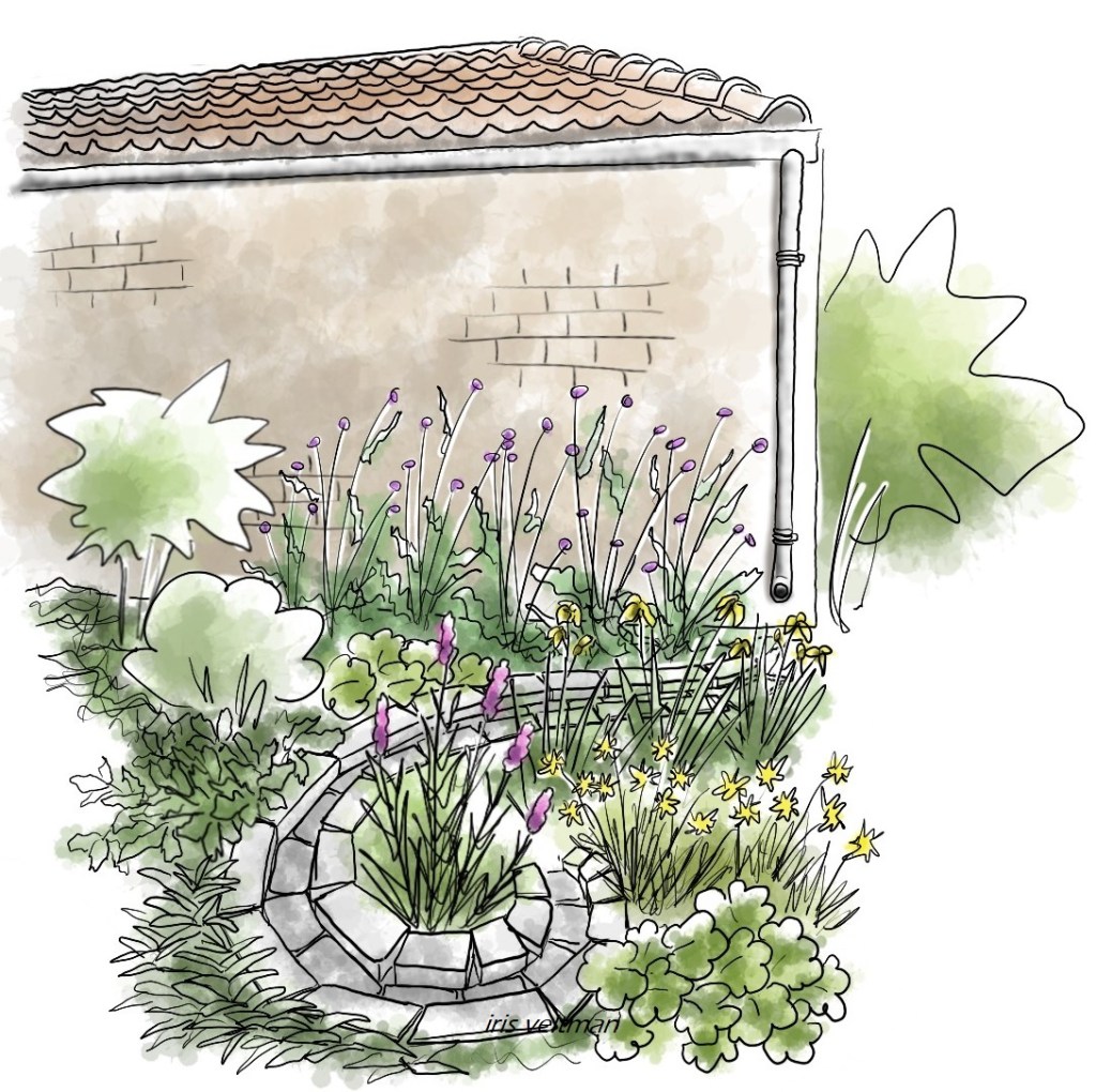 Mijn favoriete oplossing voor al deze problemen? Een regentuintje! Dat is eigenlijk niets meer dan een iets verdiepte border met planten die graag wat vochtiger staan dan planten in de omgeving. Graaf hem op een plek waar zich normaal al plassen vormen. Dat scheelt werk, want water verzamelt zich daar uit zichzelf en je hoeft dan niets extra’s te doen om het naar jouw regentuintje te krijgen. Heb je een droge tuin, maak dan een regentuintje op een plek waar je het water van een (deels) afgekoppeld dak naartoe voert. Het teveel aan water krijgt in een regentuintje de tijd om te infiltreren zonder je tuin (of huis!) te beschadigen en vult het grondwater aan, waardoor je tuin minder snel uitdroogt, verhardt of scheurt tijdens droogte!