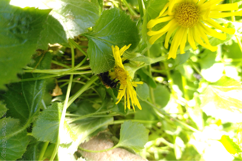Eindelijk kroop het bijtje terug mijn hand op. We stonden in de schaduw van de kamperfoelie en een hazelaar. Misschien wil ze nu zon, bedacht ik me. Dus ik liep met haar het zonnetje in – en opnieuw weet mevrouw zich pardoes van mijn hand te laten vallen. Nog nat van haar duik lukte het duidelijk niet te vliegen, maar een klokje in een pot ving haar op. Daar kroop ze wat rond, gefrustreerd (zo leek het tenminste voor mij), een beetje poetsend aan haar vleugels alsof ze daar pas besefte hoe nat ze was. (Eerst droog, dan nat – wat een leven van extremen heeft zo’n bij!) Uiteindelijk berustte ze zich bovenop een blad. De zon danste tussen de bladeren door, soms wel en soms niet over haar heen.