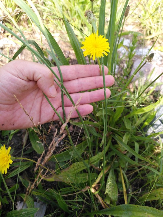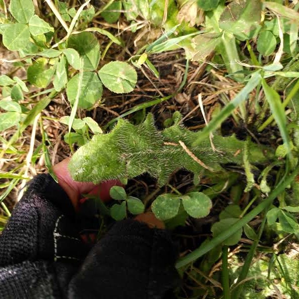 Welke plant is dit dan wel? Een hint zit ‘m in die rozetbladeren: vouw er een in de lengte dubbel, dan krijgt je de vorm van een spenende zeug. Het is gewoon biggenkruid!
